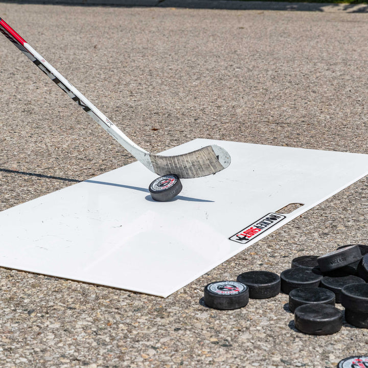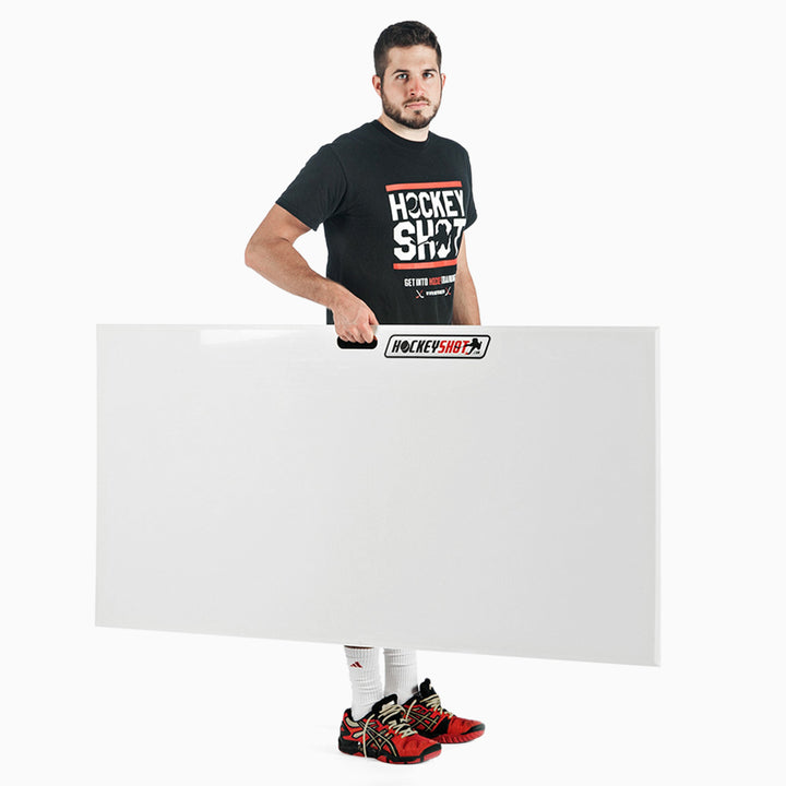 Planche de pratique pour hockey parfait pour ceux qui veulent améliorer leur jeu sur glace à la maison, les tapis de tir HockeyShot sont d'excellents outils d'entraînement intérieurs et extérieurs. Ils simulent la sensation lisse et glissante de la patinoire afin que vous puissiez travailler les passes, la manipulation du bâton et les tirs.