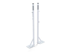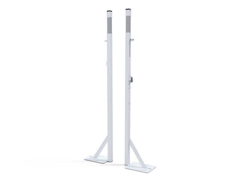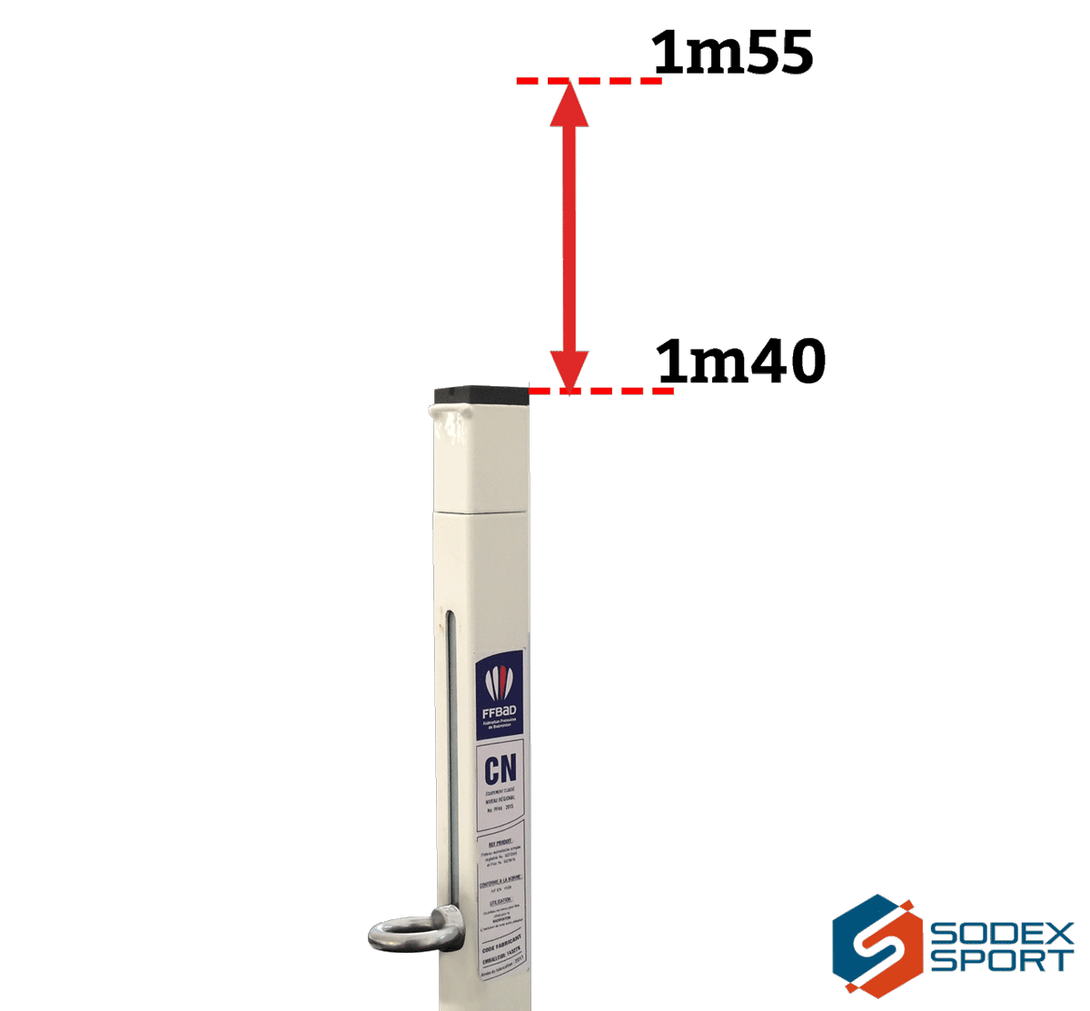 Poteaux de badminton sur plaque. Poteaux de badminton fixés au sol pour la compétition, en acier carré 40 x 40 mm, hauteur réglable de 1,40 à 1,55 m, thermolaqué blanc, utilisation avec tension du filet par sangle à cliquet.