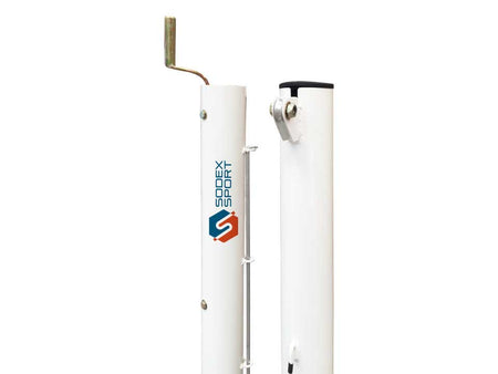 Poteaux de tennis en acier avec treuil interne. Poteaux de filet de tennis à sceller en acier galvanisé de 90mm de diamètre. Avec système de tension par treuil intérieur. Livrés avec leurs barres de cadrage pour fixation du filet (barres verticales sur la hauteur du poteau). Treuil et manivelle inclus. Espace de rangement interne pour manivelle.