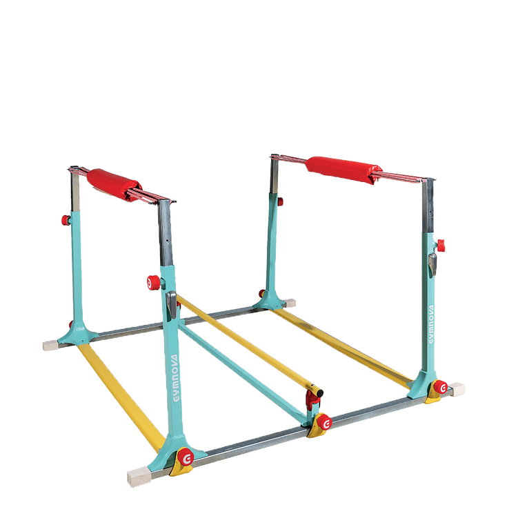 Rebondisseur double Educgym. Permet et facilite le renforcement des appuis, de la planche à l’appui tendu renversé (ATR). Agrès d’entraînement réglable en longueur et en hauteur, adaptable au poids et à la taille du gymnaste par la variation et la puissance des sandows gainés. Permet le travail des 1/2 tours, tours complets, 1/2 valse, valse à l'ATR, ... lorsqu'il est utilisé en position double, peut être combiné aux mini-agrès.