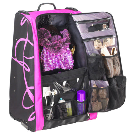 Le sac de danses en format tour sur roues DT2 offre style, grâce et fonctionnalité se rencontrant dans un système compact et facile à transporter. Le sac de danse DT2 tient debout librement et se déplace en douceur sur ses roues à bande de roulement, tiré sans effort d'une seule main. Le tissu extérieur est durable et lavable avec un chiffon humide et un savon doux. Les compartiments à fermeture éclair gardent tous vos accessoires organisés, séparés et en place tout en restant bien en vue grâce au matériau en maille élastique ou au plastique transparent. Le système de suspension intérieur maintient les costumes suspendus en toute sécurité à l'intérieur pendant le transport. Le support pliable se déplie rapidement et aucun outil n'est nécessaire pour le verrouiller en place. Les costumes peuvent ensuite être suspendus à l'extérieur pour un accès facile.