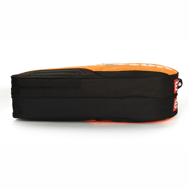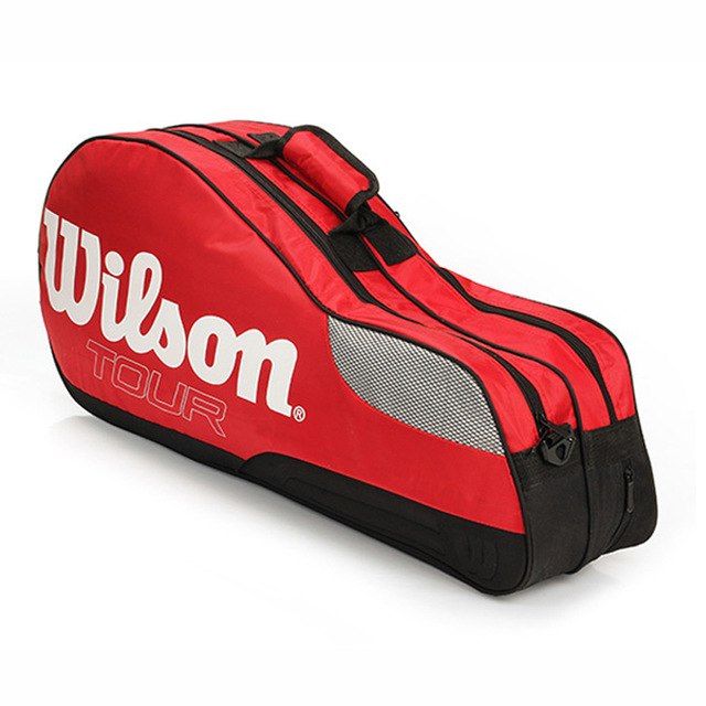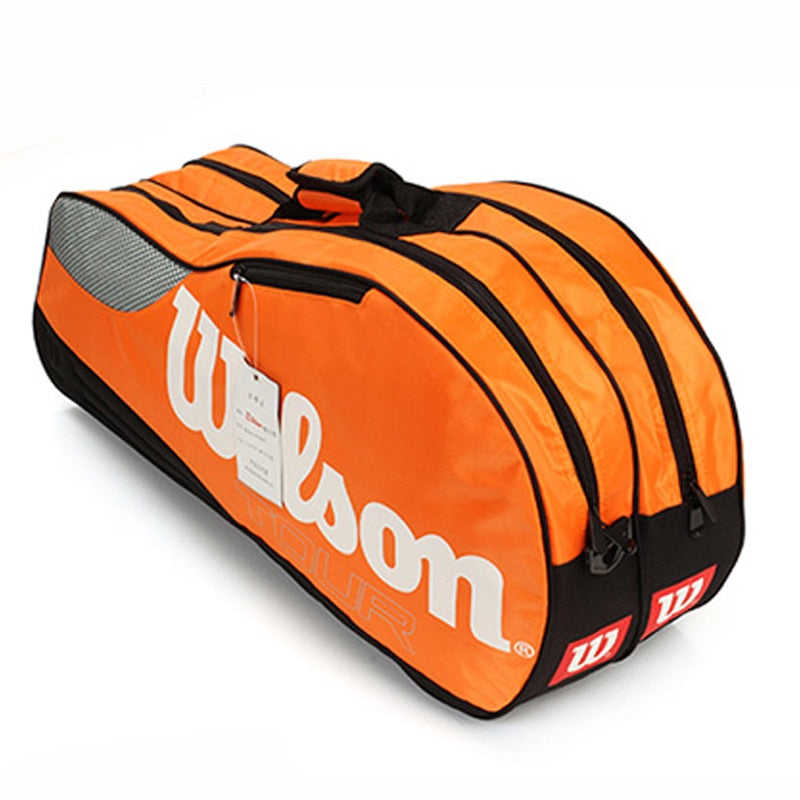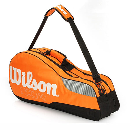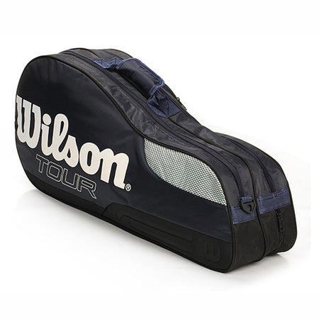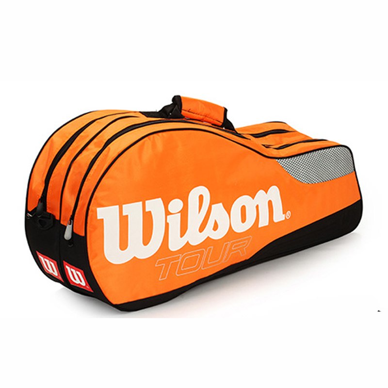 Sac d'équipement de tennis Wilson ou pour autre sport de raquettes. Fabriqué de nylon imperméable de bonne qualité. Taille de 72cm x 33cm x 20cm. Poignées à velcro et courroie d'épaule ajustable. Ce produit provient directement du manufacturier.