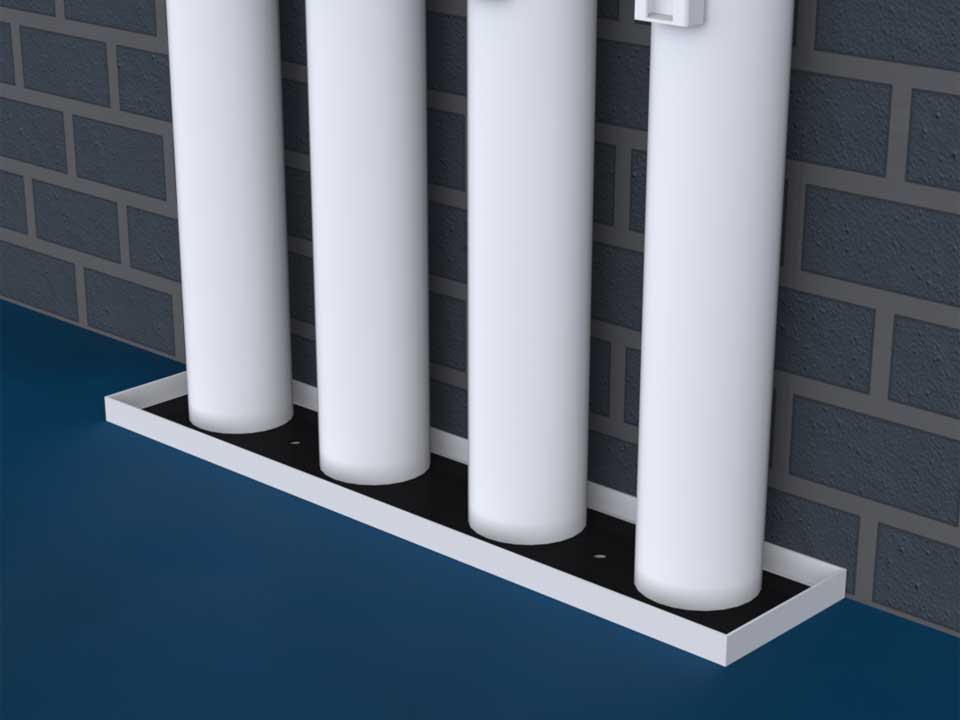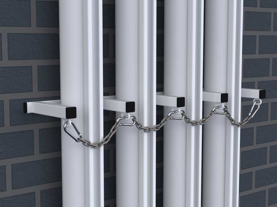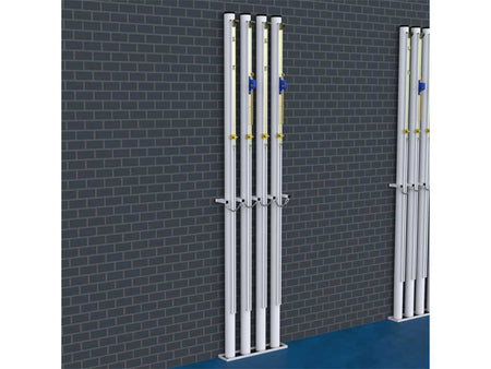 Support vertical de poteaux. Le stockage vertical permet d'optimiser l'utilisation des espaces muraux. Protection horizontale avec chaînes en acier galvanisé pour sécuriser le maintien des poteaux. Support au niveau du sol avec revêtement en caoutchouc pour stabiliser les poteaux.