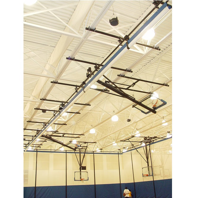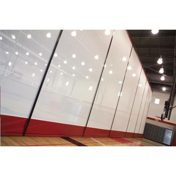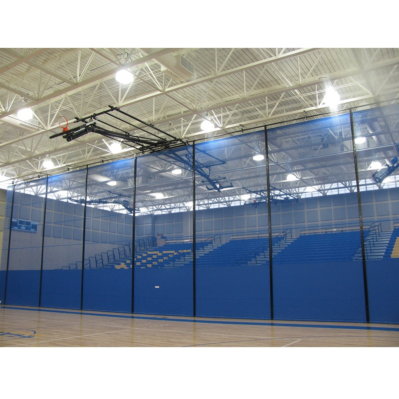 Rideau diviseur de gymnase remonte dans les airs à l'aide d'un système électrique. Permet d'optimiser l'utilisation d'un gymnase pour plusieurs classes ou activités. le système sans câble qui n'encombre pas les plafonds avec seulement 24" de rouleau en position relevé. Le rideau s'enroule facilement sans créé de mauvais pli autour d'un tube de 3.5" au sol.