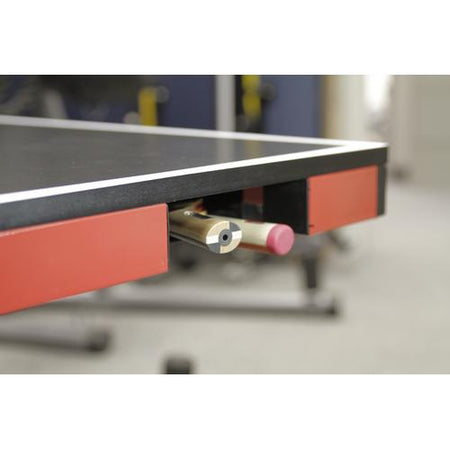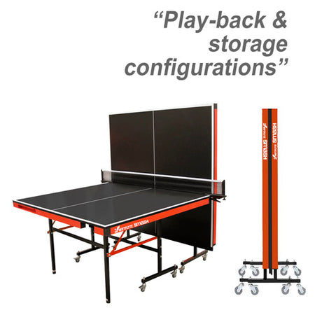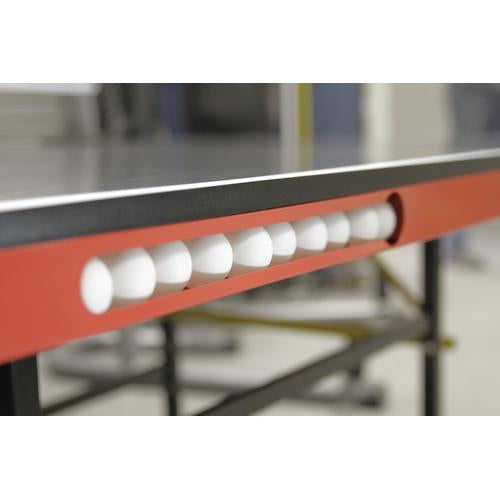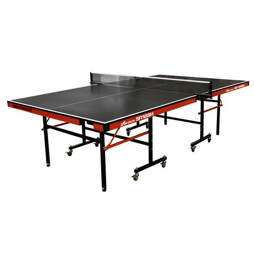 La table de ping-pong Swiftflyte Smash peut être montée en seulement 5 minutes et offrira d'innombrables heures de divertissement. La table arrive presque entièrement assemblée dans la boîte, et seuls les roulettes doivent être fixées pour une installation rapide et facile. Vissez les roulettes, retournez-la et jouez ! La table est constituée de deux parties séparées, qui se plient pour un rangement compact, et permet un réglage de la distance pour le jeu en solo. Déplacez-la facilement ou laissez-la montée pour égayer n'importe quelle pièce avec son plateau noir élégant aux accents rouges distinctifs. Elle inclut des compartiments de rangement intégrés pour les raquettes et les balles à chaque extrémité de la table.
