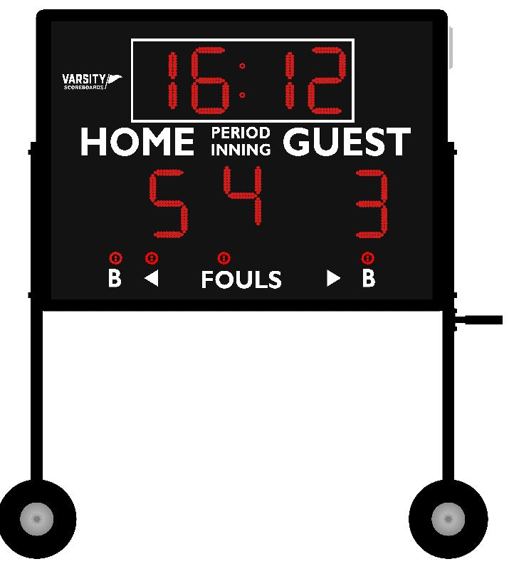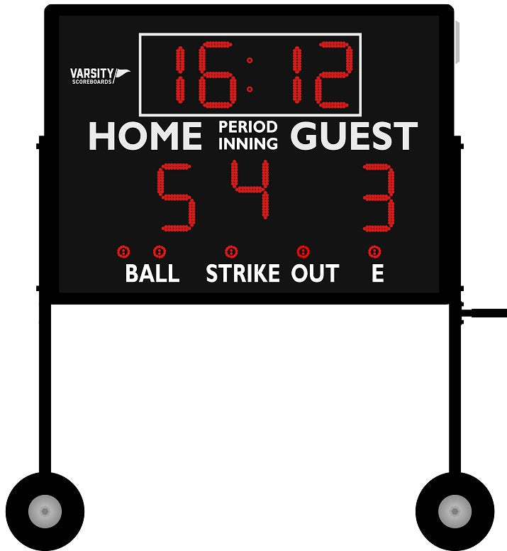 Chiffres LED 9". Armoire en acier galvanisé avec finition en poudre. Ensemble de pattes roulantes. Scores de baseball, softball, football, soccer, hockey sur gazon, crosse, volley-ball, basket-ball, lutte et athlétisme. Klaxon intégré. Télécommande sans fil. Batterie interne rechargeable