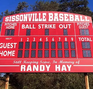 Tableau indicateur extérieur de Baseball Varsity lettrage avec choix anglais ou Français. Fabriqué au États-Unis garantie de 5 ans. Dimension de 16′ x 5′ x 8″