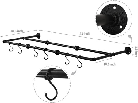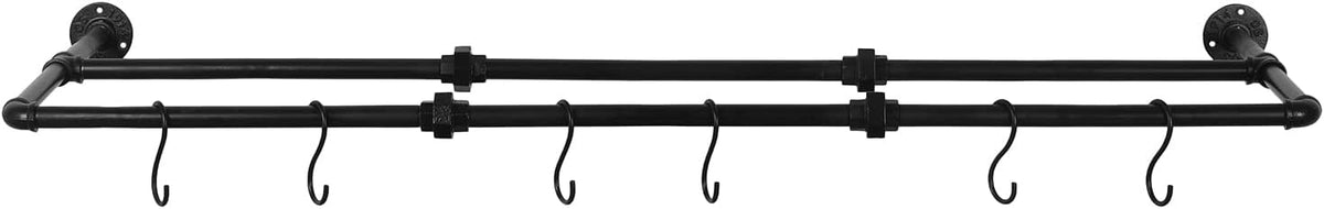 Tablette de rangement. Support de rangement mural pour ballons de yoga d'exercice, en métal de style industriel, avec finition enduite de poudre noire et 6 crochets en S.