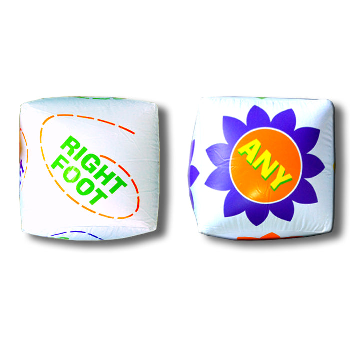 - Jetez les deux dés gonflables géants pour savoir quelle partie de votre corps vous devez placer sur quelle fleur de couleur.