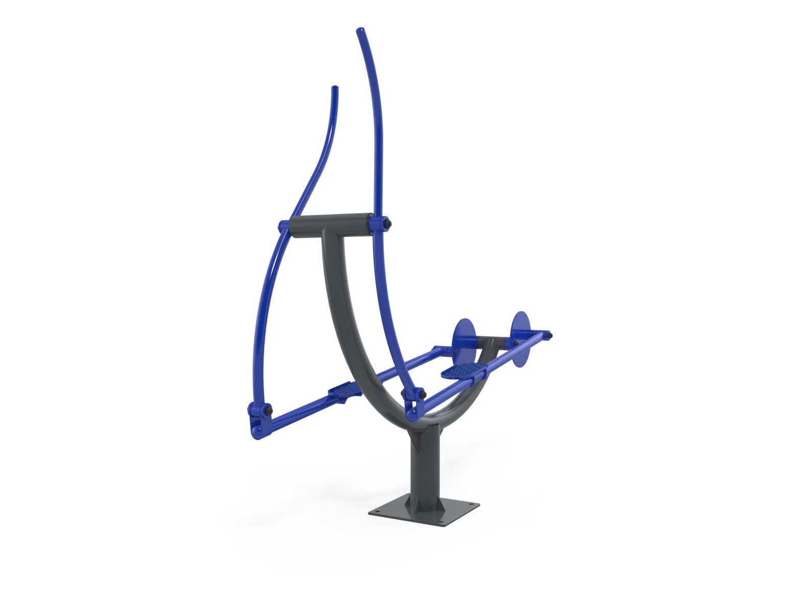 Structure fabriqué en acier galvanisé plastifié et peint gris. Élément mobile Repose-pieds anti-dérapants et rebords. Élément mobile en acier galvanisé peint bleu.